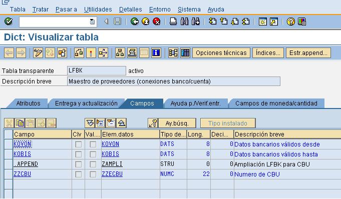 Tengo un problema con la definición de campos sensibles en la SPRO, a traves del item "Def.campos sensibles p.ppio.verif.p/2 o más pers.(deudores)" quiero ingresar un CAMPO SENSIBLE de la tabla LFBK y no me deja. Este campo lo ingresé en la LFBK a través de una estructura append en la cual coloco un CAMPO Z. Yo no sé si es porque es un campo Z o porque me falta configurar algo más para que SAP pueda ver este campo y tomarmelo como CAMPO SENSIBLE.