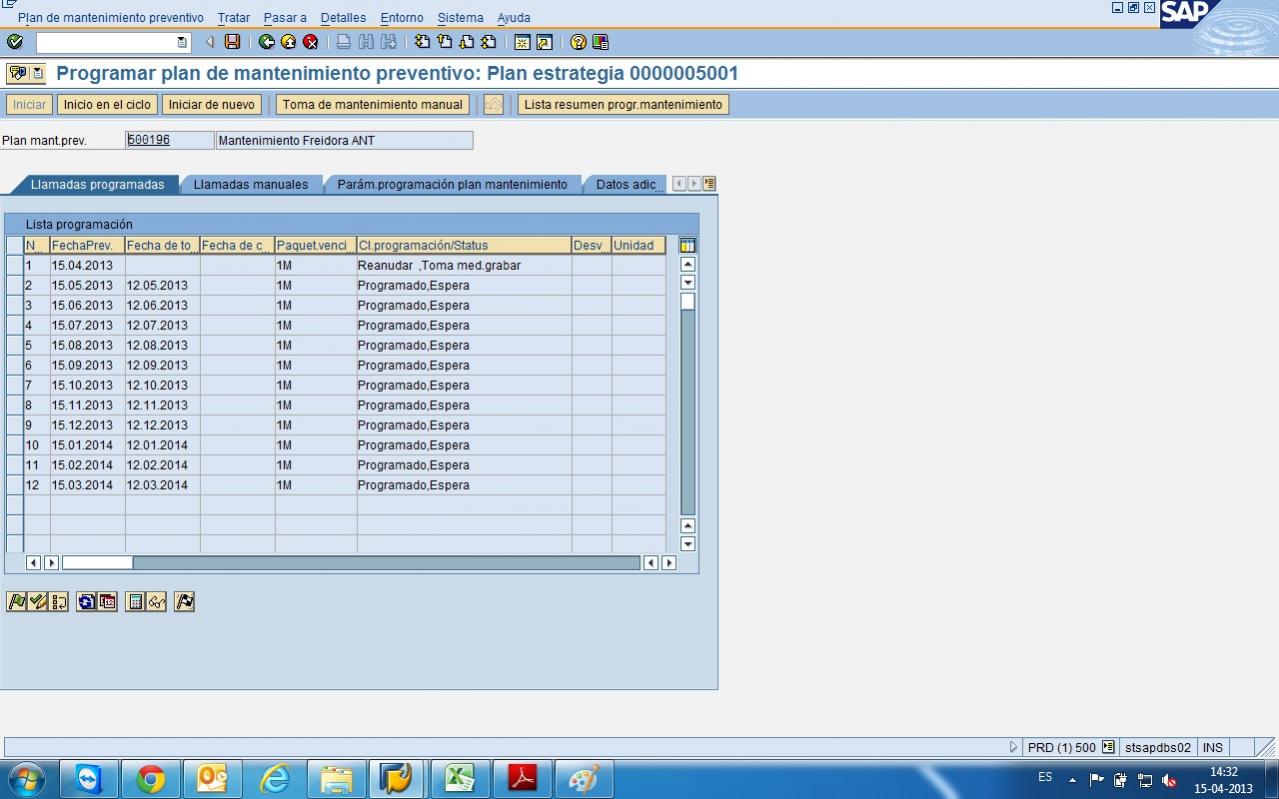 Al momento de crear un plan de mantenimiento y luego de programarlo, me encuentro con que hay planes que no se les genera la fecha de toma (que es la fecha en la cual se generará la Orden de Mantenimiento), por lo tanto, para algunos meses no tengo la Orden de Mantenimiento por lo tanto no me esta sirviendo la programacion. Me he fijado, revisan la IP10 que el mes en cuention le aparece el estado de "Reanudar ,Toma med.grabar" y la celda de "Fecha de Toma" en blanco.